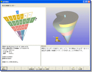 診断の結果は3Dの回転するコマで立体表示され、傾き具合で食事バランスが一目瞭然。さらに、主食、主菜などのどれが不足してどれが過剰か、問題点が自動的に表示されます。