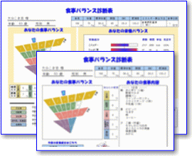 診断の結果は画面だけでなく、カラフルな診断表としてプリントアウトできます。診断表は献立スタイル、グラフスタイルの2種類ご用意してありますので好みに応じて使い分けできます。栄養のことはよく分からない・・・という方にも分かりやすく、喜ばれること間違いなし!